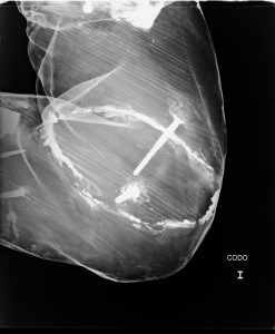 En esta radiografía se aprecian tornillos de ensamble en el codo del brazo izquierdo.